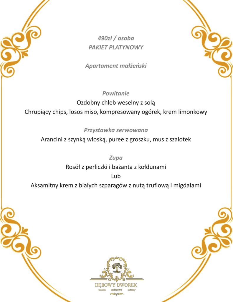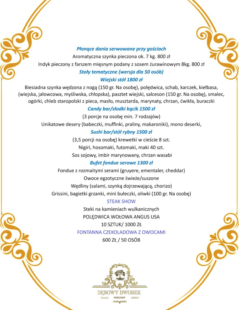 Nasz szef kuchni, z pasją do smaków, przygotuje dla Was i Waszych gości wyśmienite menu, które zachwyci najbardziej wymagających smakoszy. Oferujemy różnorodne opcje kulinarne, aby sprostać różnym preferencjom i dietom.
